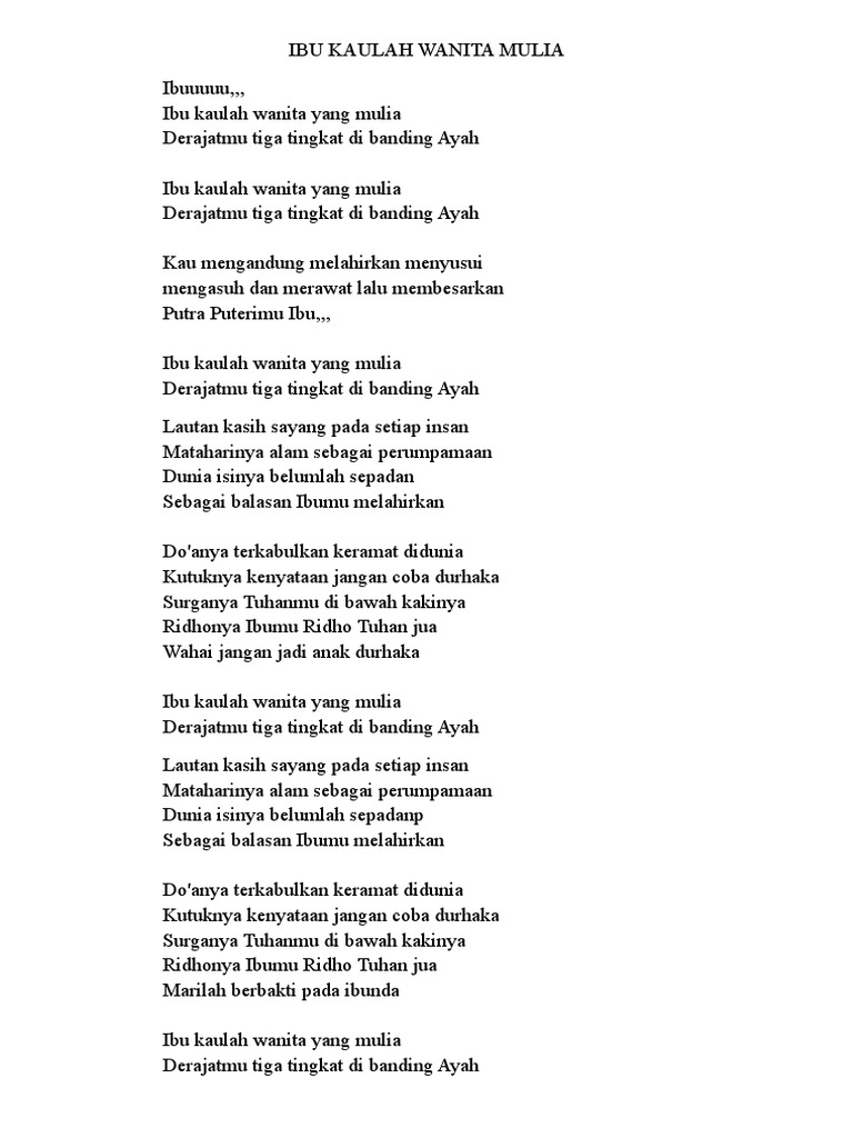 Aku Tak Bisa Luluhkan Hatimu. Tak terhingga sepanjang masa Hanya memberi Bagai sang surya menyinari. Ibu kau lah Wanita yang mulia Derajatmu tiga tinggkat Dibanding ayah 2x Kau mengandung melahirkanmenyusui Mengasuh dan merawat Lalu membesarkan Putra putrimu ibu 2x Lautan kasih sayang Pada setiap insan Mataharinya alam Sebagai perumpamaan Dunia isinya Belumlah sepadan Sebagai balasan.
